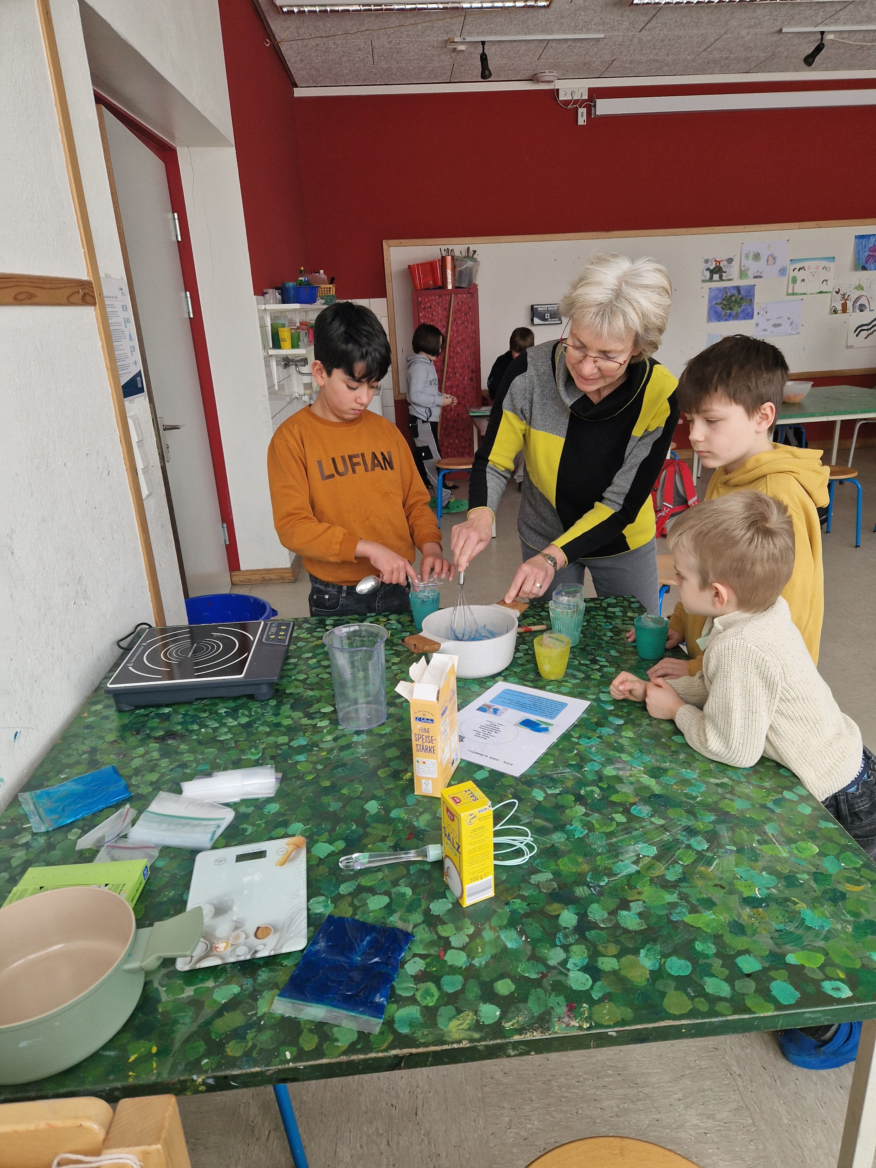 Auch chemische Versuche standen auf dem Programm: Beim Herstellen von Schleim, Badebomben oder kleinen Lavalampen beobachteten die Kinder spannende Reaktionen. Erste Erfahrungen im Programmieren sammelten sie mit kleinen Robotern in Form einer Biene, sogenannten Bee-Bots, die dank der Förderung neu angeschafft werden konnten.